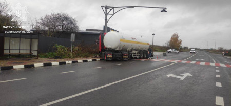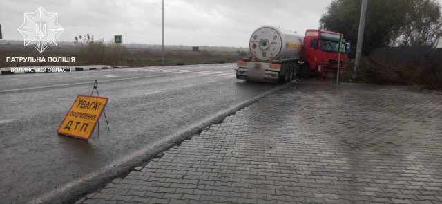 На Волині на автодорозі М-19 відбулася дорожньо-транспортна пригода. Volvo з цистерною, щоб не наїхати на пішохода, влетів в електроопору.