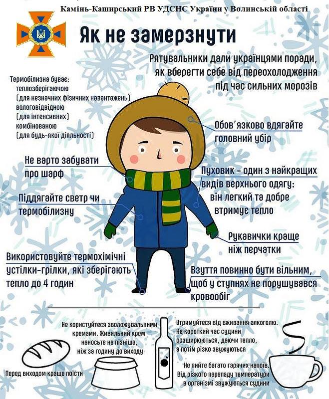 Щоб не допустити подібних випадків Камінь-Каширський районний відділ Управління ДСНС України у Волинській області застерігає, що у період низьких температур ризик переохолоджень та обморожень зростає, обмежте тривале перебування на вулиці особливо при сильному вітрі та високій вологості, в першу чергу це стосується дітей та людей літнього віку.
