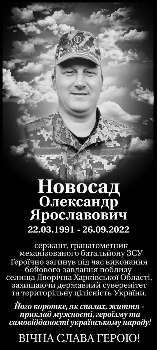 Олександр Новосад загинув 26 вересня 2022 року при виконанні бойового завдання поблизу селища Дворічна на Харківщині. У Героя залишилася дружина і двоє маленьких дітей, синочок народився за кілька днів по смерті батька.