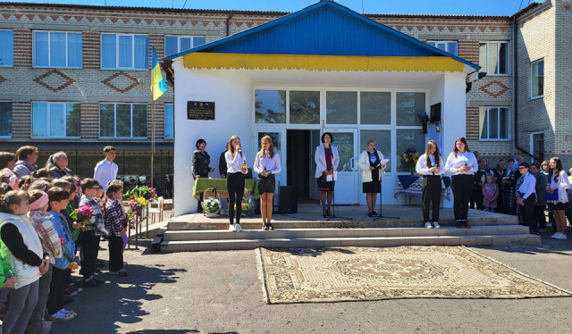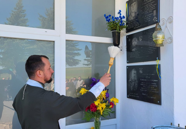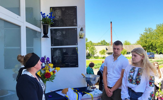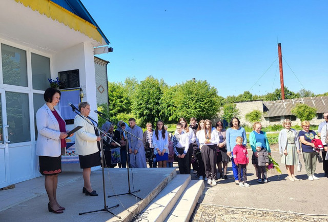 Честь відкрити меморіальну дошку було надано доньці Євгенії та сину Дмитру.Зі скорботним словом до присутніх звернулася дружина захисника Тетяна.