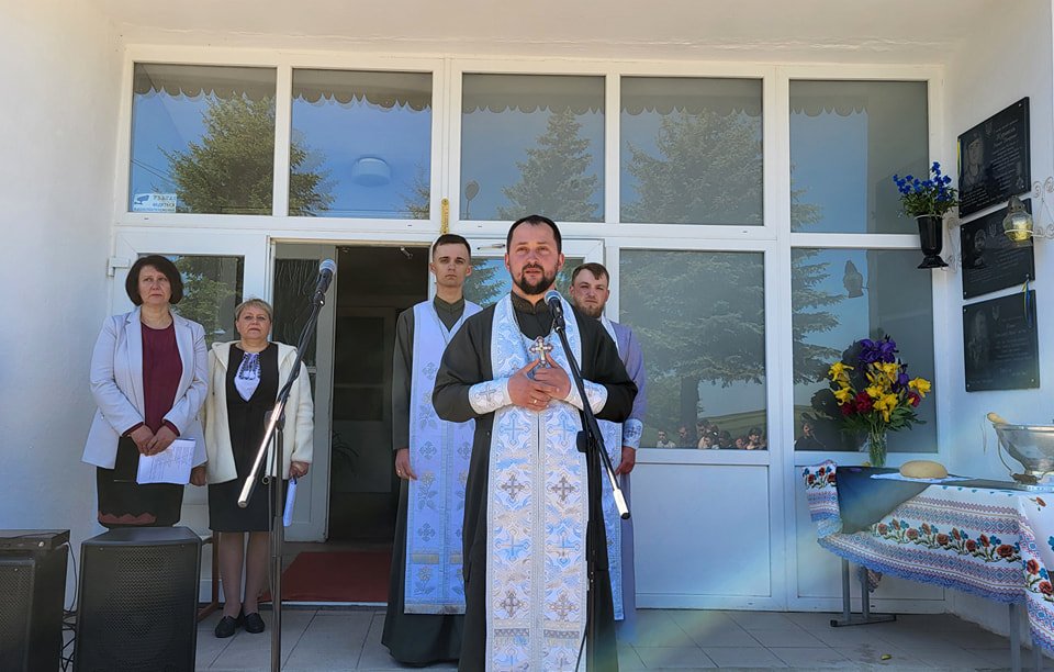 Честь відкрити меморіальну дошку було надано доньці Євгенії та сину Дмитру.Зі скорботним словом до присутніх звернулася дружина захисника Тетяна.