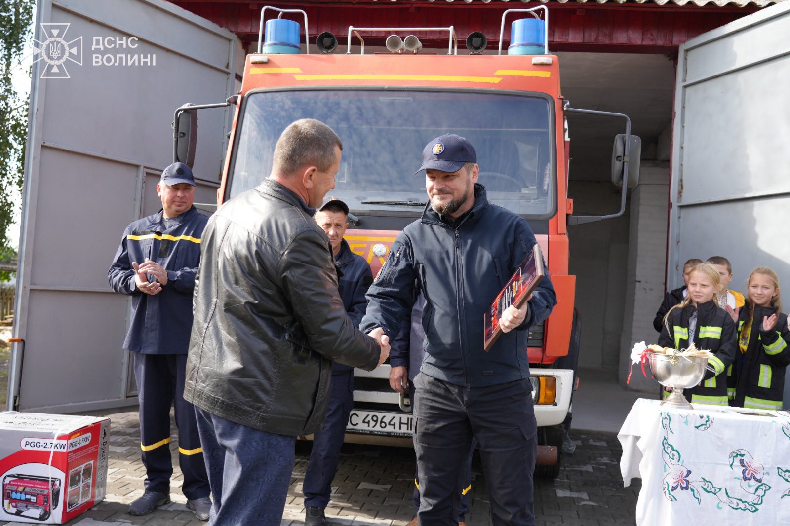 Керівник служби 101 передав підрозділу генератор, старосту села відзначив подякою за підвищення рівня пожежної безпеки громади, а від благодійників з Німеччини вогнеборці отримали пожежне авто.