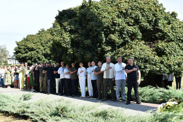 Потому відбулося покладання квітів до пам’ятника «Борцям за волю і незалежність України» та пам’ятного фотостенду «Герої Небесної Сотні – Загинули за Єдність України».«Нехай наше синє небо буде без ракет та безпілотників, а колосиста, родюча земля – без мін та вибухівок», – додав ведучий.