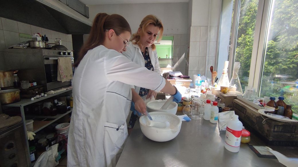 Над приготуванням пасти Теймурова від пітливості та грибків працює студентка Анастасія. Каже: зараз таку мазь важко знайти в аптеках. Дівчина приходить волонтерити сюди майже щодня та здобуває практичні вміння.