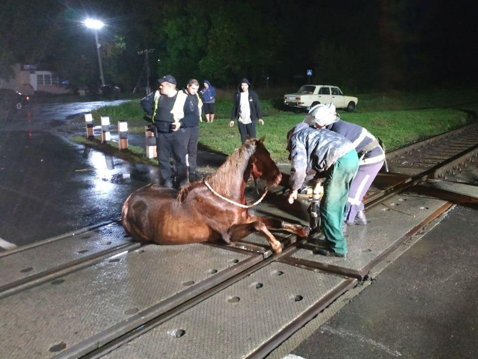 На Волині рятувальникам довелося вивільняти коня, який потрапив копитом в отвір між рейковими коліями та бетонною плитою залізничного переїзду у місті Рожище.