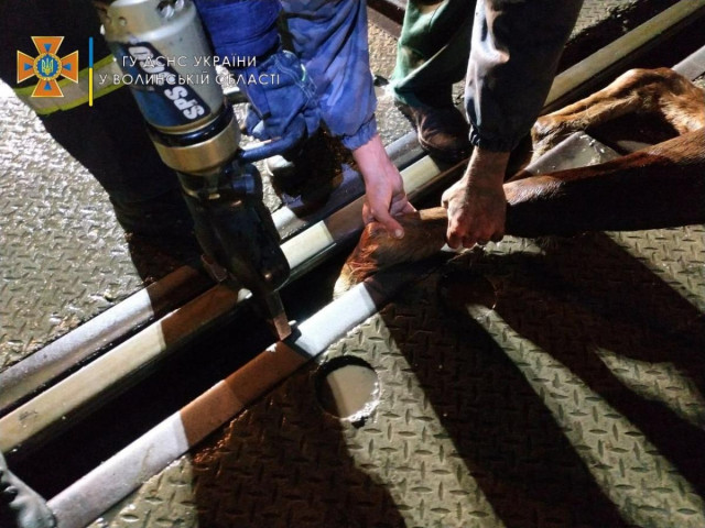 Рятувальники за допомогою гідравлічних ножиць збільшили проміжок між рейкою і плитою та врятували свійську тварину з пастки.