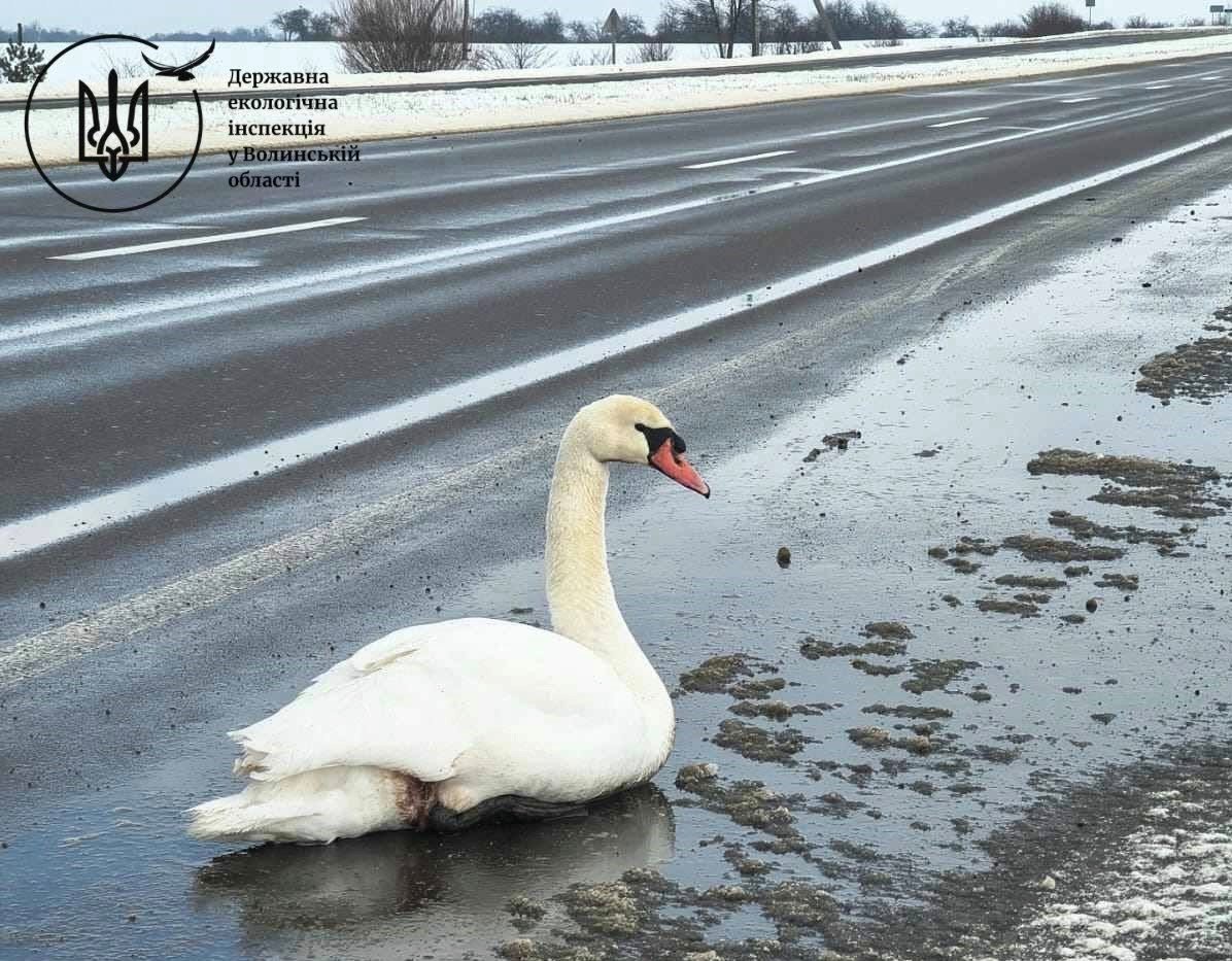 На Волині врятували пораненого лебедя, який лежав на узбіччі траси