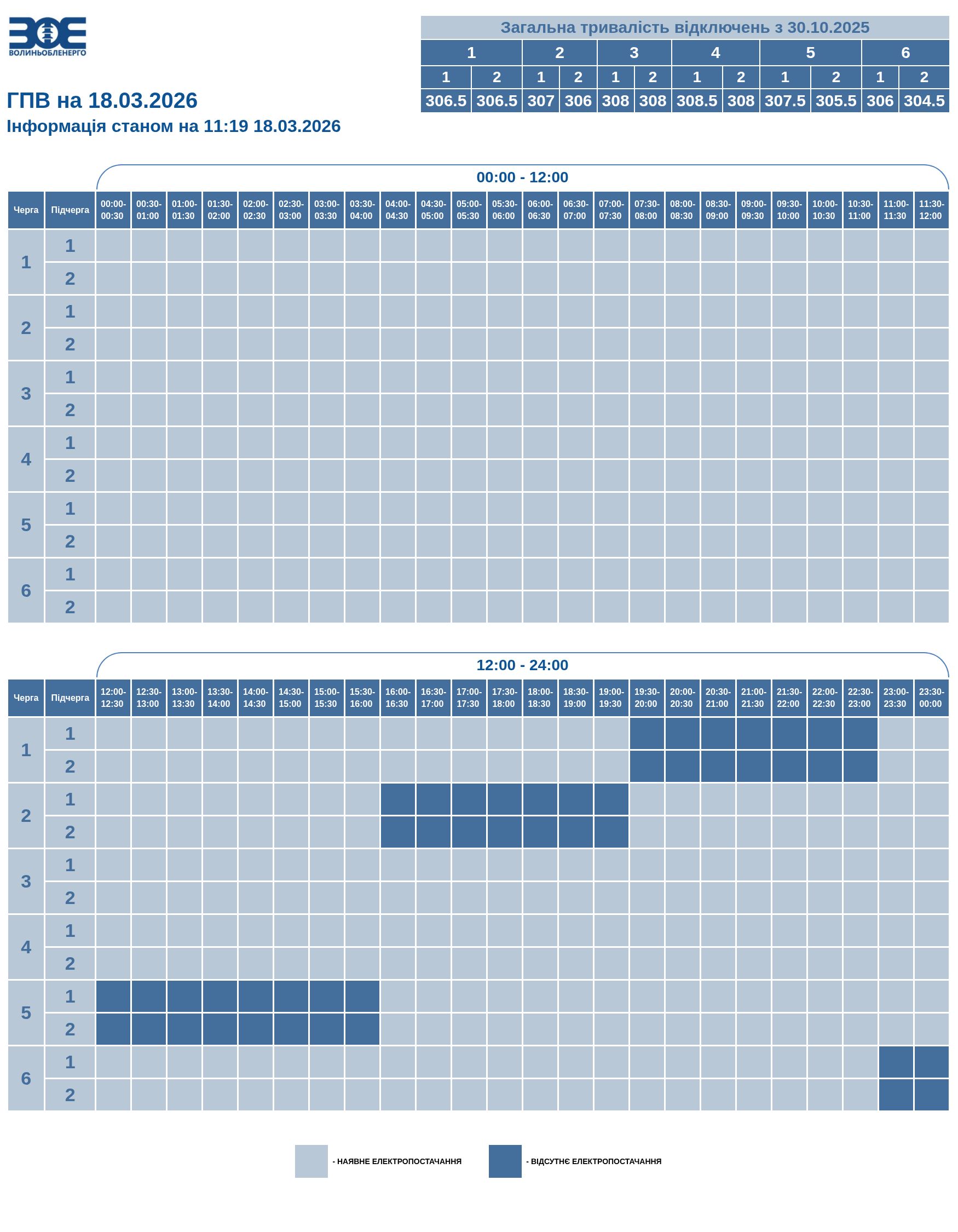 Час відключення та відновлення електропостачання може відрізнятись від заявленого у графіку на 20-30 хвилин. Таке відхилення пов'язане із технологічним процесом перемикання черг службами «Волиньобленерго».
