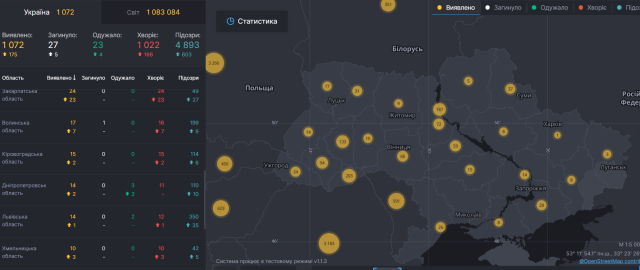 Загалом, згідно карти, кількість осіб з виявленою інфекцією коронавірусу в Україні становить 1072 особи. З них – 27 загинуло, 23 – одужало та 1022 хворіють.
