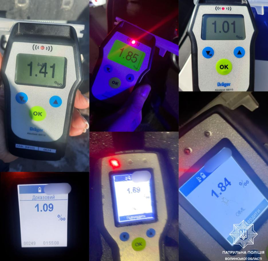 У Луцьку під час дії комендантської години інспектори зупинили автомобіль Volkswagen. Спілкуючись із водієм, помітили у нього ознаки алкогольного сп'яніння. Огляд проводився на місці зупинки. Результат — 1,84 проміле.