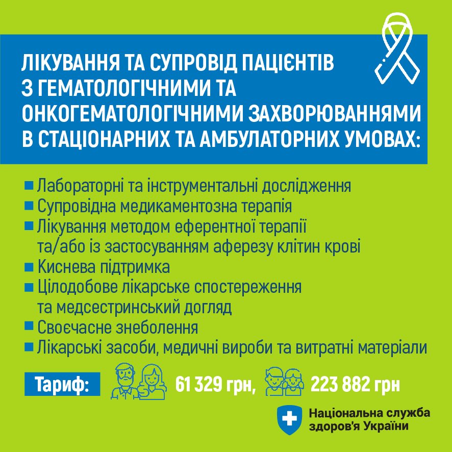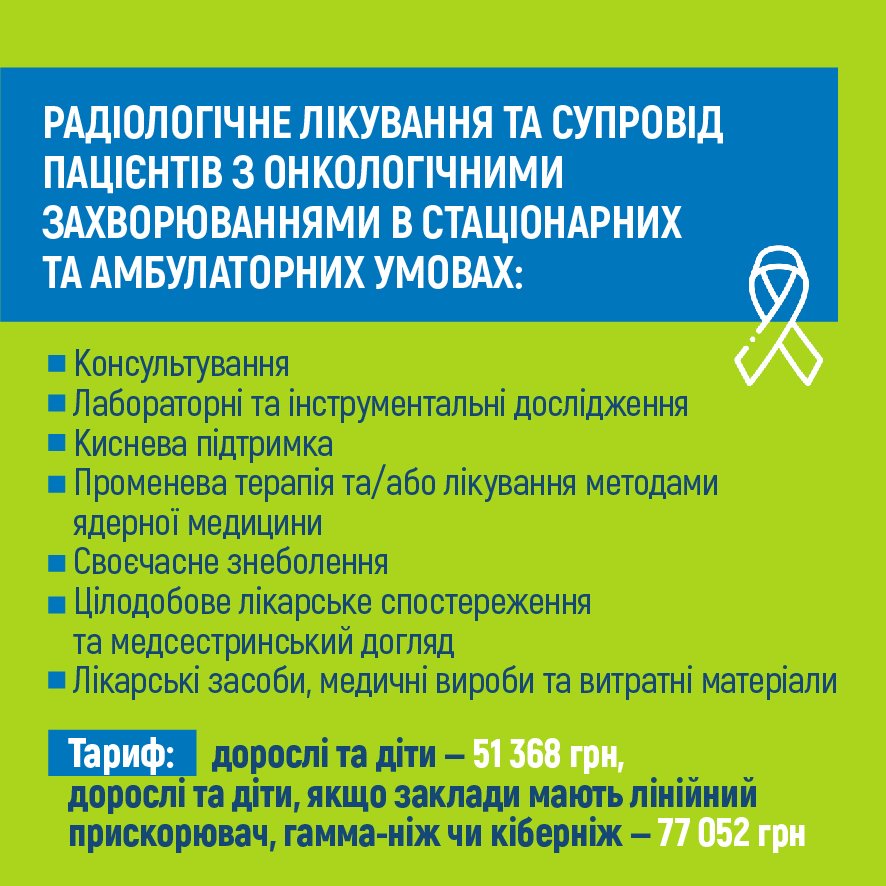 Пацієнт із підтвердженим онкологічним діагнозом або гематологічним захворюванням має право на безоплатне хіміотерапевтичне та радіологічне лікування, а також на лікування методом еферентної терапії або із застосуванням аферезу клітин крові. Лікування може бути в амбулаторних або стаціонарних умовах та включає лабораторні й інструментальні дослідження, ліки, медичні вироби, витратні матеріали, інтенсивну терапію, кисневу підтримку, знеболення, анестезію.Якщо в медзакладі є лінійний прискорювач, гамма-ніж або кібер-ніж, то променева терапія з цим обладнанням теж включена в безоплатні послуги.Читати ще: «Важливо виявити на початковій стадії», – луцький онколог про симптоми та діагностику раку шлунка