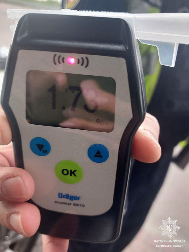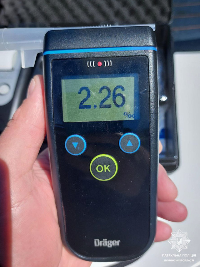 У Луцьку інспектори отримали повідомлення від громадянина про те, що водій Skoda Oktavia, ймовірно, керує напідпитку. Незабаром схожий автомобіль поліцейські виявили на вулиці Грушевського. Під час спілкування з 39-річним керманичем інспектори й справді помітили у нього ознаки сп’яніння. Drager показав 2,26 проміле, що перевищує допустиму норму у 15 разів.
