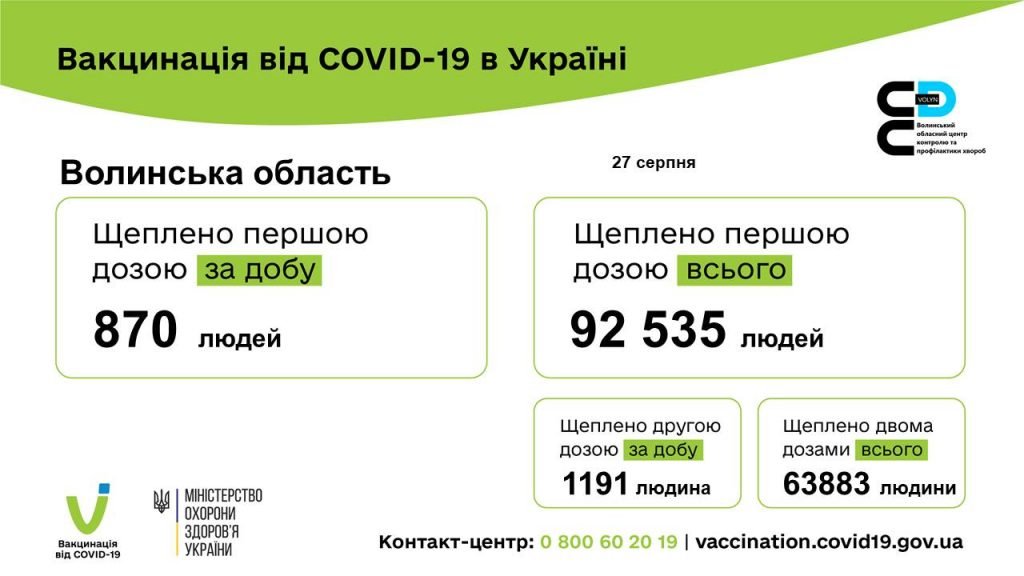 За добу 27 серпня 2021 року проти COVID-19 в області проведено 2061 щеплення. Першою дозою щеплено 870 осіб та другою дозою – 1191 особу.