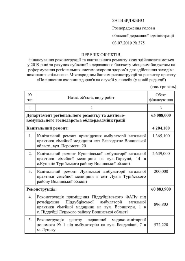 Про нову редакцію переліку об’єктів, фінансування реконструкції та капітального ремонту яких у 2019 році здійснюватиметься за рахунок субвенції з державного бюджету місцевим бюджетам на реформування регіональних систем охорони здоров’я для здійснення заходів з виконання спільного з Міжнародним банком реконструкції та розвитку проєкту «Поліпшення охорони здоров'я на службі у людей» йдеться у розпорядженні тимчасового виконувача обов’язків голови Волинської ОДА.