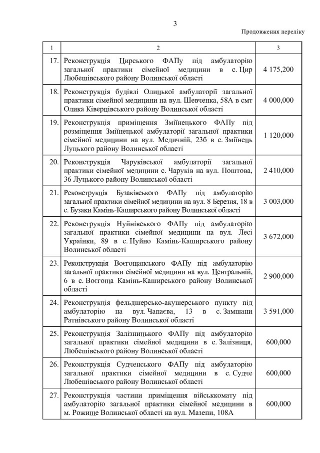 На реконструкцію 30 приміщень у різних районах області під амбулаторії витратять 60,883 мільйона. Найбільші суми передбачені: на реконструкцію Цирського ФАПу під амбулаторію загальної практики сімейної медицини в селі Цир Любешівського району – 4,175 мільйона, на реконструкцію будівлі Олицької амбулаторії загальної практики сімейної медицини на вулиці Шевченка, 58А в селищі Олика Ківерцівського району – 4 мільйони, на реконструкцію лазні під Полицівську амбулаторію загальної практики сімейної медицини на вулиці Волі, 5А в селі Полиці Камінь-Каширського району – 4 мільйони, на реконструкцію будівлі пришкільного інтернату Забузької ЗОШ І – ІІІ ступенів Любомльського району під амбулаторію загальної практики сімейної медицини – 3,7 мільйона, на реконструкцію Нуйнівського ФАПу під амбулаторію загальної практики сімейної медицини на вулиці Лесі Українки, 89 в селі Нуйно Камінь-Каширського району – 3,672 мільйона.