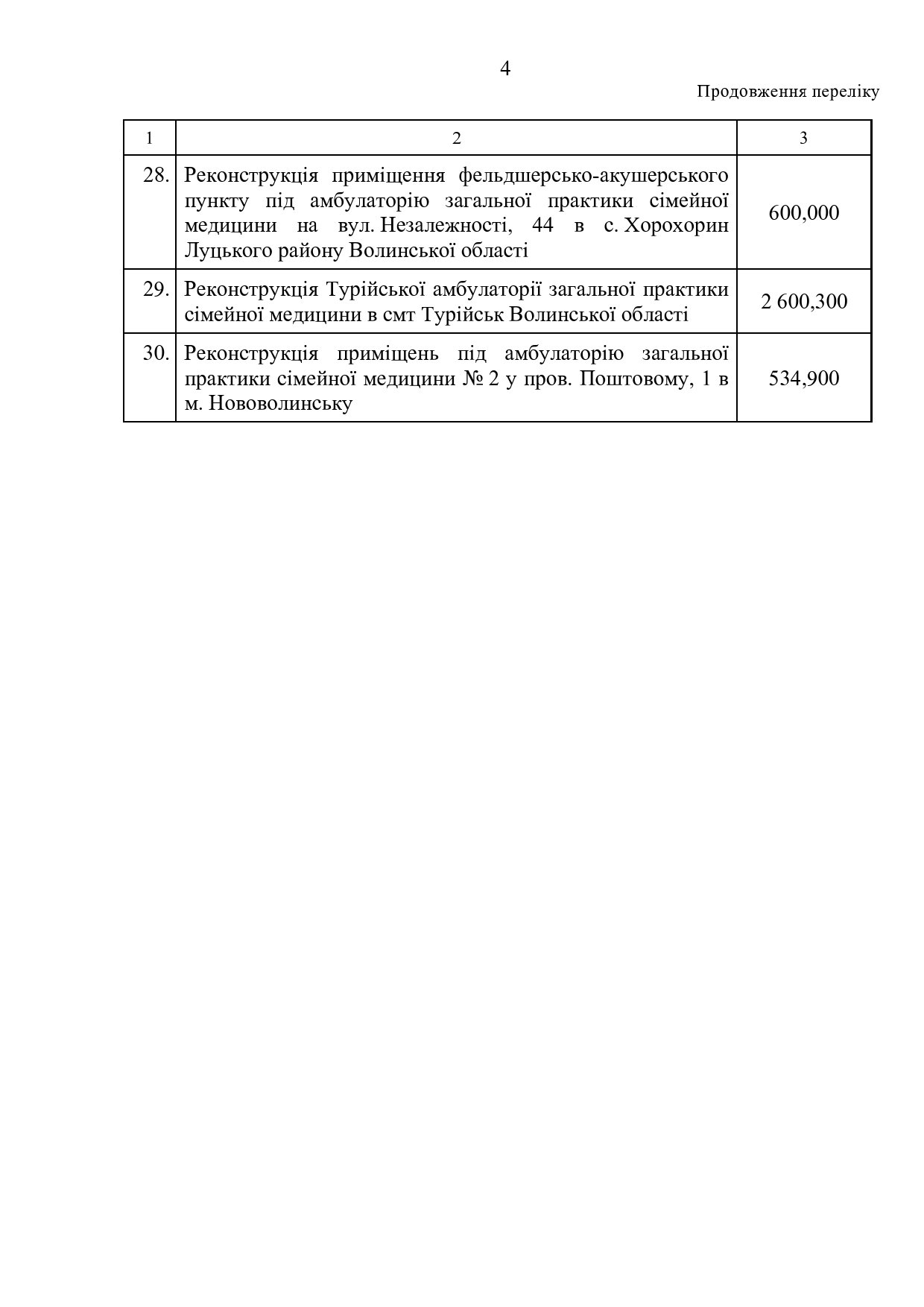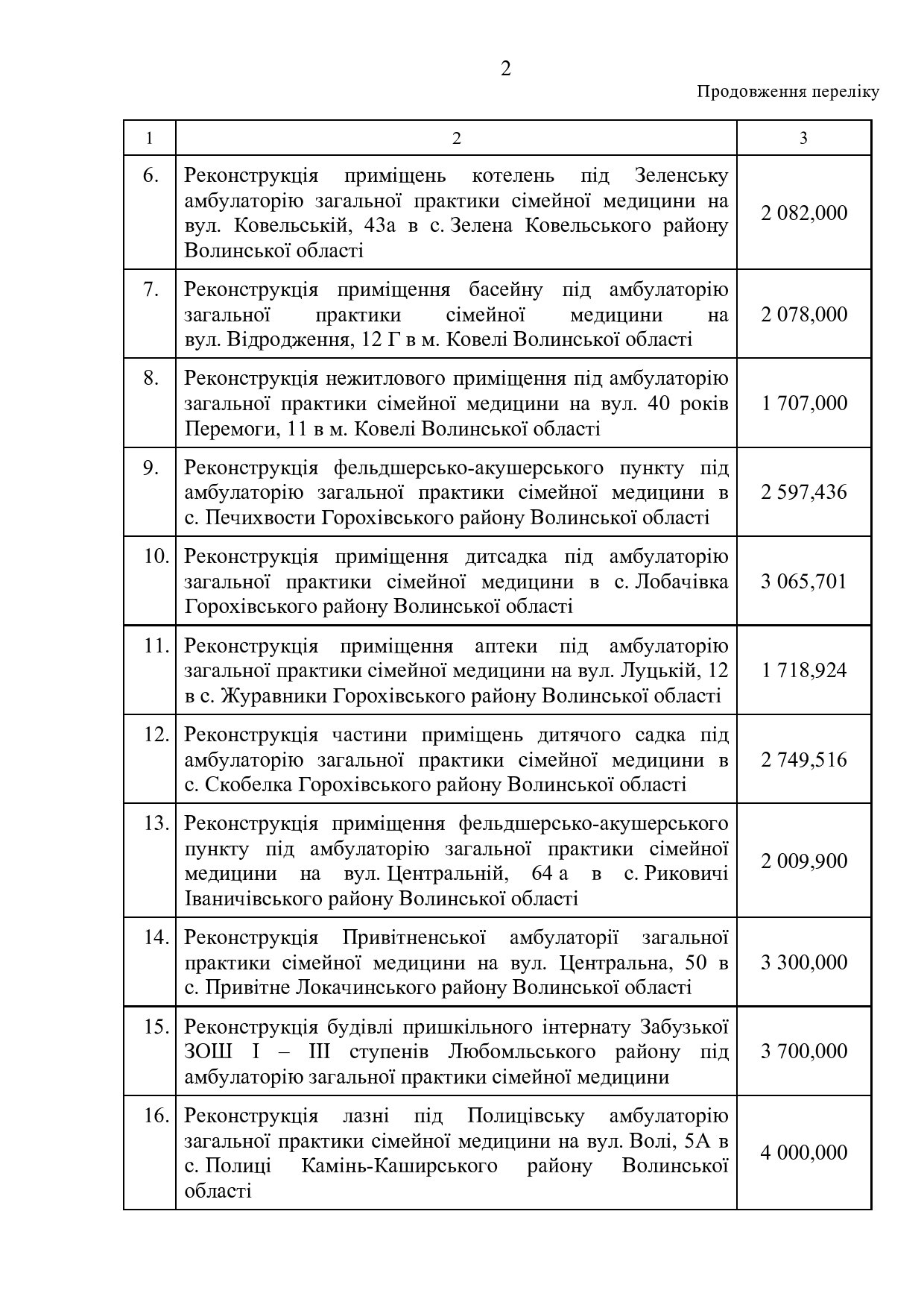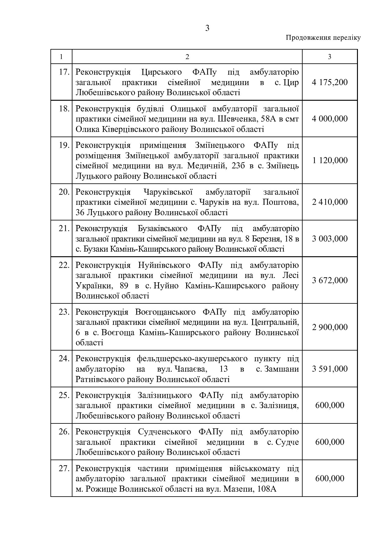 На реконструкцію 30 приміщень у різних районах області під амбулаторії витратять 60,883 мільйона. Найбільші суми передбачені: на реконструкцію Цирського ФАПу під амбулаторію загальної практики сімейної медицини в селі Цир Любешівського району – 4,175 мільйона, на реконструкцію будівлі Олицької амбулаторії загальної практики сімейної медицини на вулиці Шевченка, 58А в селищі Олика Ківерцівського району – 4 мільйони, на реконструкцію лазні під Полицівську амбулаторію загальної практики сімейної медицини на вулиці Волі, 5А в селі Полиці Камінь-Каширського району – 4 мільйони, на реконструкцію будівлі пришкільного інтернату Забузької ЗОШ І – ІІІ ступенів Любомльського району під амбулаторію загальної практики сімейної медицини – 3,7 мільйона, на реконструкцію Нуйнівського ФАПу під амбулаторію загальної практики сімейної медицини на вулиці Лесі Українки, 89 в селі Нуйно Камінь-Каширського району – 3,672 мільйона.