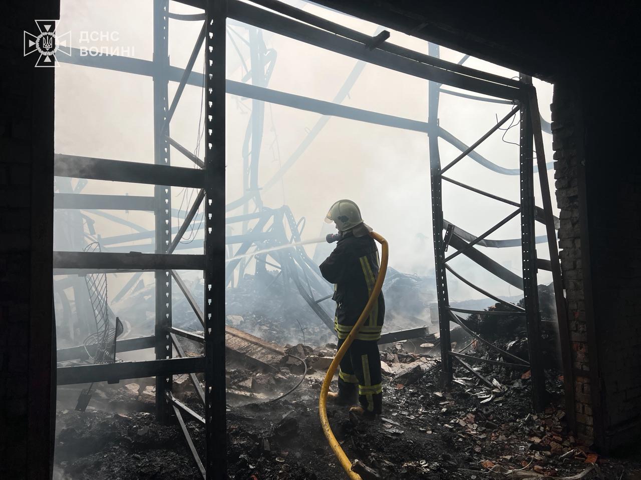 Як повідомив міський голова Ігор Поліщук, унаслідок атаки ворога виникла пожежа у складських приміщеннях з продуктами харчування. Знищено майно, оздоблення та продукцію на площі орієнтовно 3800 кв. м.У поліції Волині повідомили, що близько 50 поліцейських наразі документують наслідки прильотів.У ГУ ДСНС Волині інформували, що залучено 12 одиниць техніки, робота для пожежогасіння. Працюють понад пів сотні рятувальників. О 9:24 пожежу локалізували.Інформація про потерпілих не надходила.