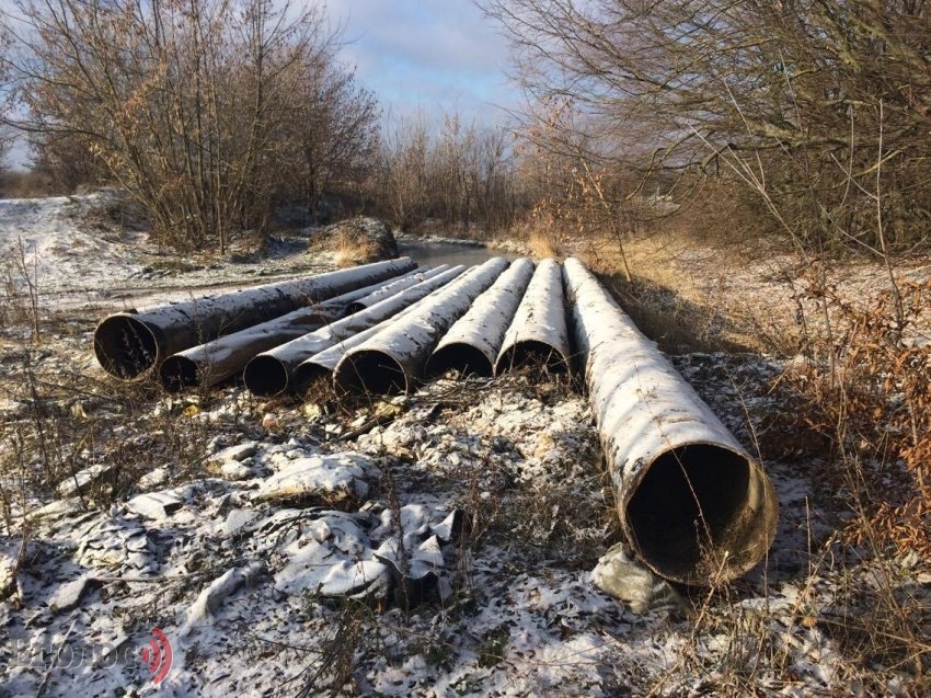 Довжелезні, великого діаметру труби, викопані на полях фільтрації цукрового заводу, лежать при автошляху з Володимира-Волинського на Луцьк.