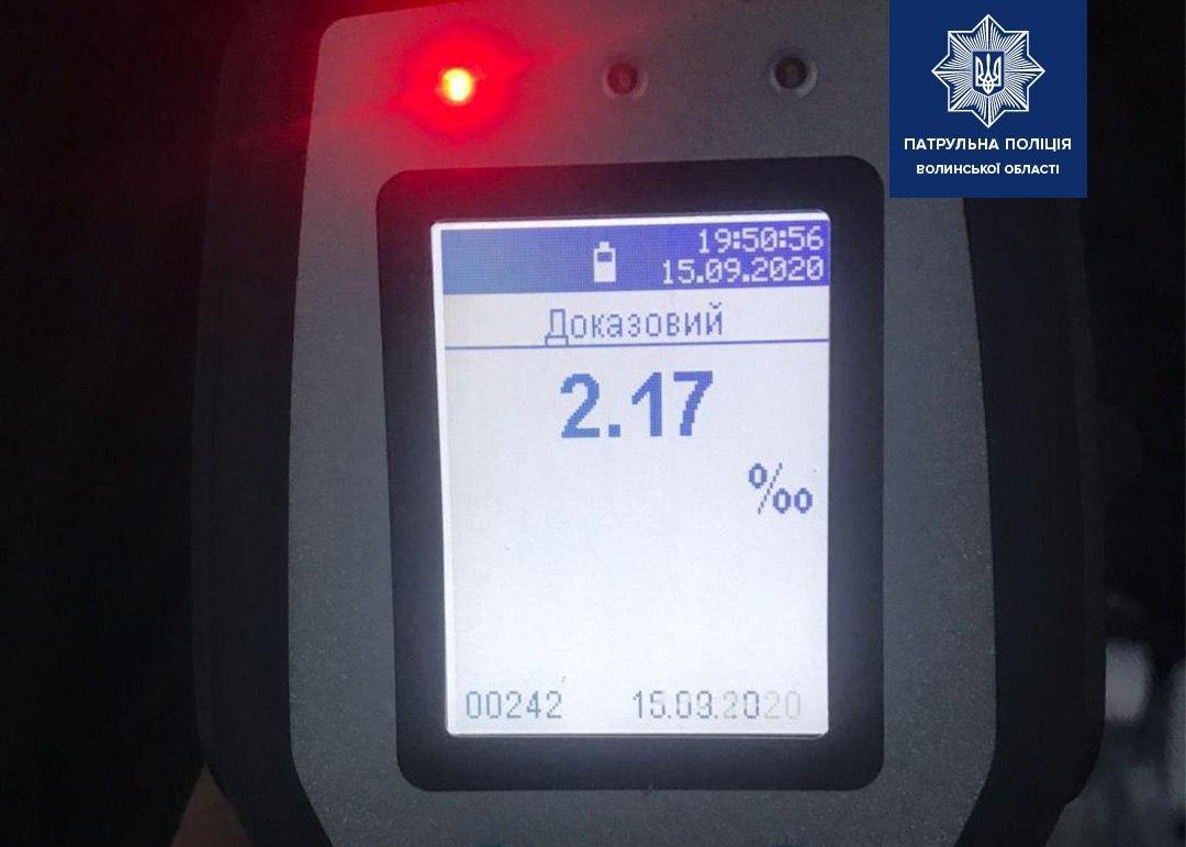 Під час спілкування з водієм, у нього виявили явні ознаки алкогольного сп’яніння. У присутності двох свідків, чоловік пройшов освідування на стан алкогольного сп’яніння. Результат – 2.17 проміле, що майже в 11 разів перевищує допустиму норму. Водія відсторонили від керування транспортним засобом.