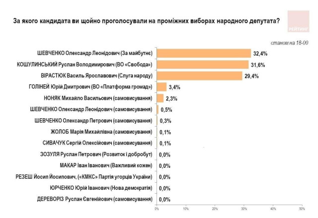 Другим іде представник ВО «Свобода» Руслан Кошулинський – йому віддали свої голоси 31,6% виборців.