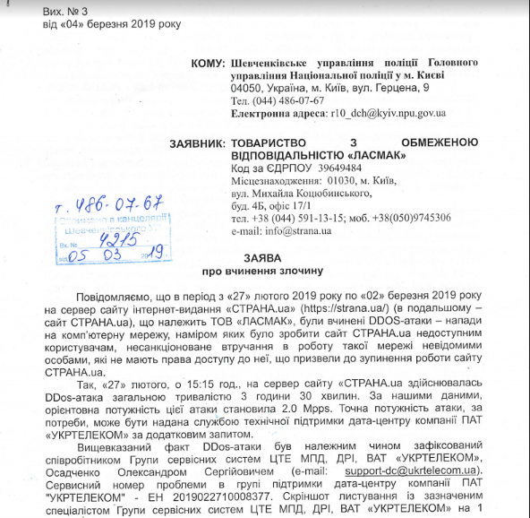 4 березня Страна подала заяву до Шевченківського управління поліції Києва про вчинення злочину. За даними «Страны», атака здійснювалася на замовлення СБУ. Її метою було не допустити поширення матеріалів про передвиборну системі підкупу #Сітка на користь Петра Порошенка. Перший матеріал був оприлюднений 20 лютого, незадовго до першої атаки.
