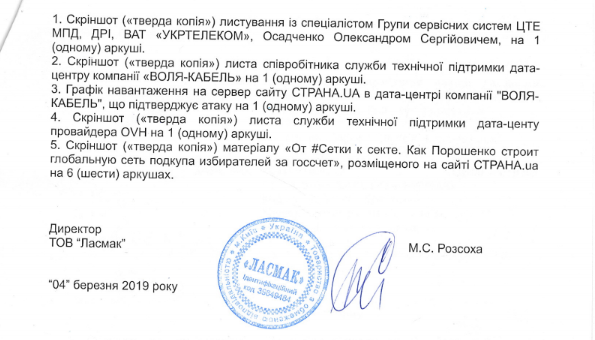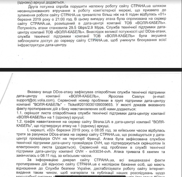 Сервісний код проблеми в службі підтримки датацентру компанії OVH, що підтверджує протиправне втручання в роботу сервера сайту Страна.ua, що знаходиться на території Євросоюзу – sv93034-ovh. Атака була зафіксована службою підтримки датацентру компанії OVH, що підтверджує скріншот їхнього листа (є у розпорядженні редакції).