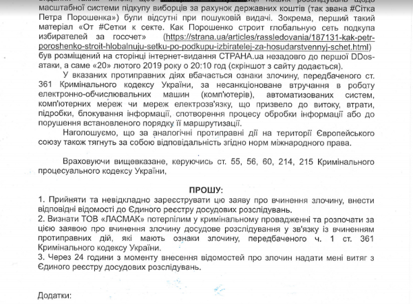 У зазначених протиправних діях Страна вбачає ознаки злочину, що передбачає відповідальність за ст. 361 КПК України – незаконне втручання в діяльність електронно обчислювальних систем і мереж.