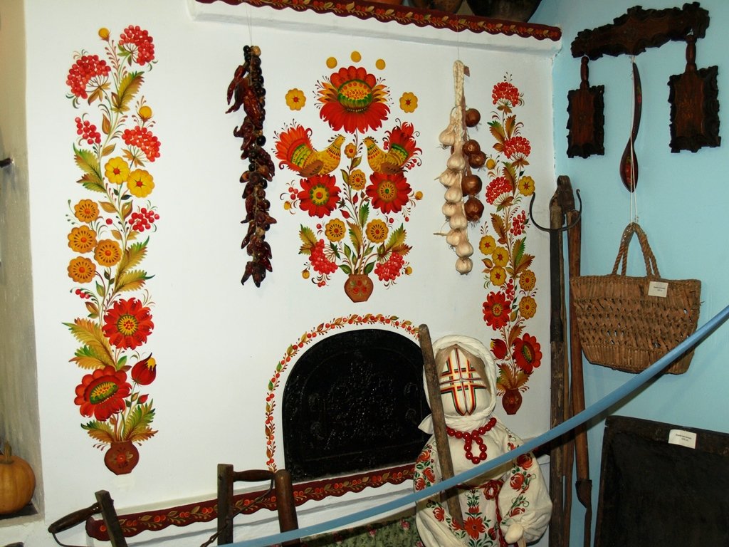 Починається експозиція з залу, де представлений інтер’єр хати селянина кінця XIX- початку XX століть. Вишиті картини на стінах, годинник із зозулею, ліжко з вишитими наволочками та простирадлом, ткані доріжки. На мить здалося, що я в хаті моєї бабусі на Поліссі. Найбільшою прикрасою кімнати є піч, розмальована яскравим рослинним орнаментом. Безцінним спадком від попередніх поколінь українців наступним.«Мистецтвознавці стверджують, що нашому розпису майже три сотні років, – розповідає екскурсовод музею Олена Арбузова-Терещенко. – Першим у цій місцевості наприкінці XVII століття оселився козак Петрик, звідси й назва Петриківка. А вже біля нього будувались інші. Хати жінки білили, а по білому малювали, аби кожна господа відрізнялася від сусідньої. Фарби робили з відварів рослин, сажі, глини. Першим інструментом їх нанесення був палець. Пізніше стали використовувати шматочки стебла рогозу, який росте на берегах річок. Ще один пензлик, притаманний нашому розпису – це так звана кошачка. Непоказний на вигляд, він виготовляється лише вручну з шерсті домашніх пухнастиків. Її вистригають у котиків на грудях, між передніми лапками. Шерсті для однієї кошачки треба зовсім небагато, тому домашні улюбленці від стрижки не страждають».Якщо зробити мазок таким пензликом, каже пані Олена, він матиме форму краплинки з гострим кінчиком. Це одна з особливостей петриківського розпису. Краплинками зазвичай малюють фантастичні форми рослинних орнаментів. Наприклад, так звані квіти-цибульки, кучерявки. Здавна вважали, що кожен елемент розпису має певне сакральне значення.«Центральна частина печі називається дзеркало, – провадить далі екскурсовод. – І тут зазвичай малювали дерево життя, яке ви бачите перед собою. У нижньому ярусі кетяги калини нахилені донизу. В цьому випадку це символізує те покоління господарів, які пішли в засвіти. Далі квіти – символ життя. На них сидять птахи – символ добра, щастя, спокою. Зверніть увагу, що вони майже одного зросту, однаково розмальовані, зображені на одному рівні. Це символізує рівність, гармонію, а повернуті один до одного – ще й кохання. Вище – наша кучерявка – квітка, де пелюстки нагадують цибульки. Чітко промальовані зернятка – дітки. Три кружечки над усією композицією – це духовність, зв’язок із Богом. Часник і цибуля по боках – обереги, які захищають піч-матінку від усього лихого».