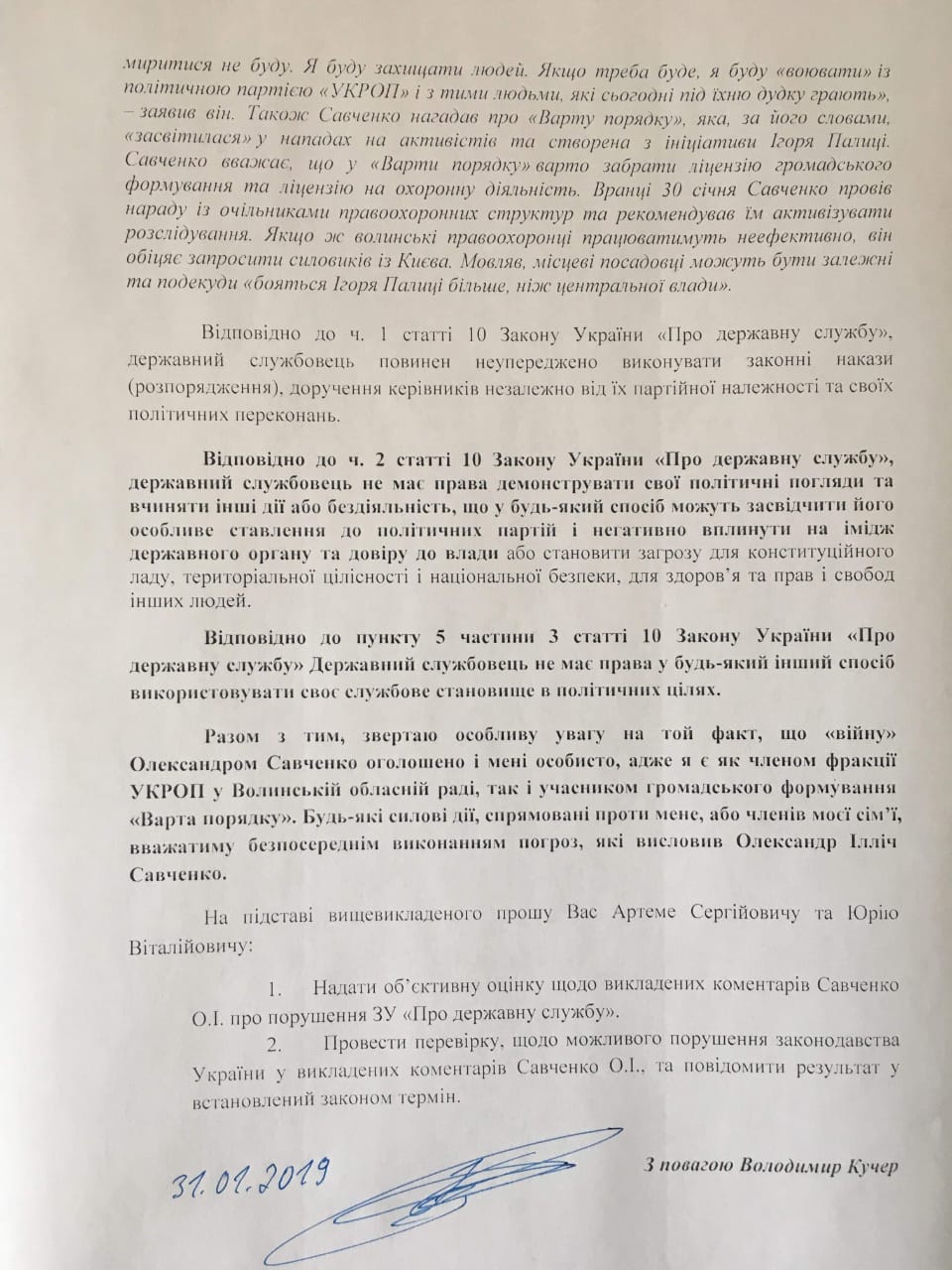 «Війну» Олександром Савченко оголошено і мені особисто, адже я є як членом фракції УКРОП у Волинській обласній раді, так і учасником громадського формування «Варта порядку». Будь-які силові дії, спрямовані проти мене, або членів моєї сім’ї, вважатиму безпосереднім виконанням погроз, які висловив Олександр Ілліч Савченко», - пояснює депутат.