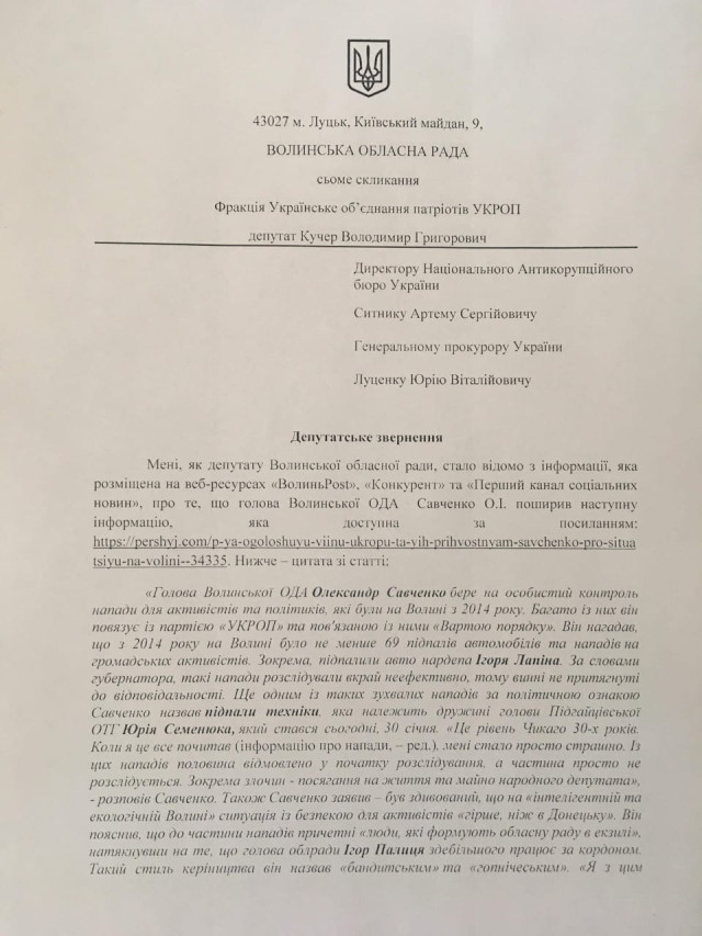 Перевірити голову Волинської ОДА Олександра Савченка через погрози держслужбовця та «оголошення війни» опозиційній політсилі просять в Національного Антикорупційного бюро України та Генеральної прокуратури України.