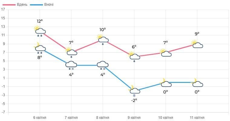 8 квітня очікують хмарну погоду з проясненнями. Вночі невеликий дощ із мокрим снігом. Удень невеликий дощ. Вітер північно-західний, 7-12 м/с, удень пориви 15-20 м/с. Температура повітря вночі коливатиметься від нуля до 5° тепла, на поверхні ґрунту заморозки 0-5°, вдень – 6-11° тепла.Читати ще: Потужна магнітна буря набирає обертів: коли і кого зачепить