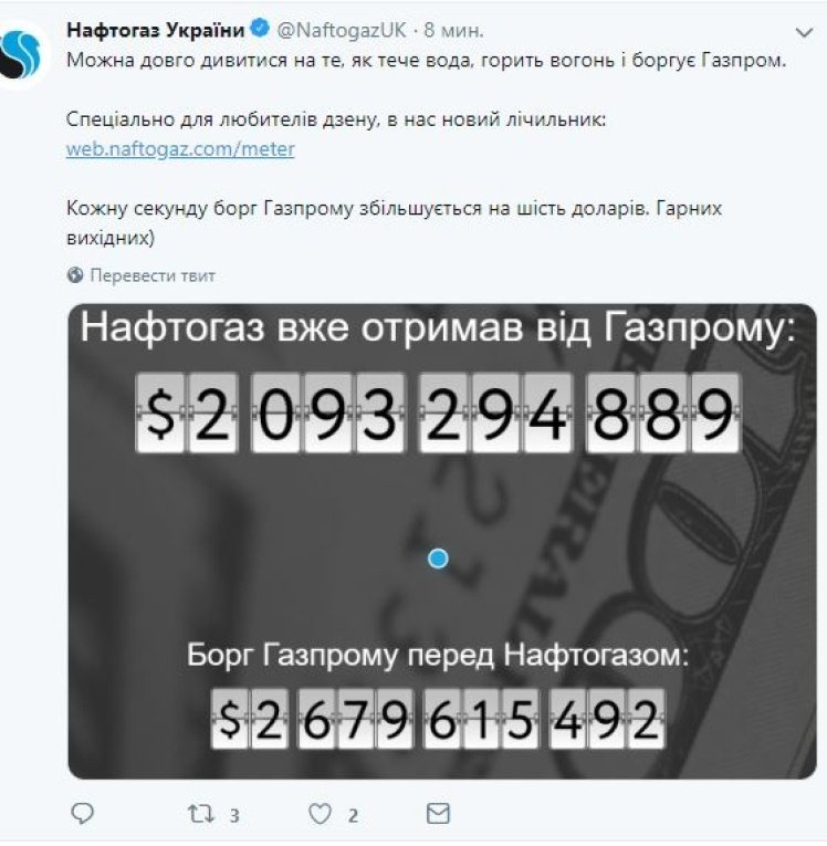 Крім того, в Twitter НАК «Нафтогаз» з'явився «лічильник», який показує в реальному часі, як збільшується борг «Газпрому».