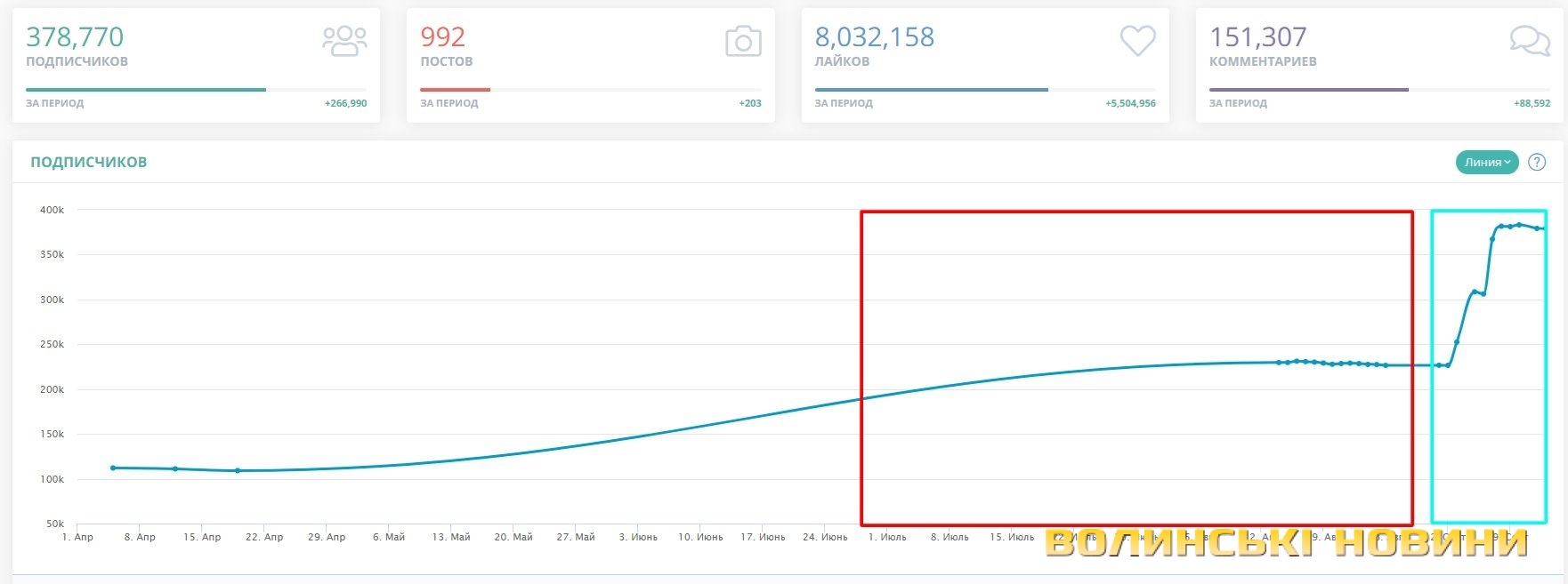 Блакитним показаний період більш активної реклами. Можемо допустити, що це була одночасна реклама у кількох топових блогерів, або ж участь у розіграшах в якості спонсора (коли ви платите за участь, а бажаючі отримати приз виконують кілька умов: підписуються, ставлять лайки на фото, залишають коментарі та інше) або «накрутка» підписників.