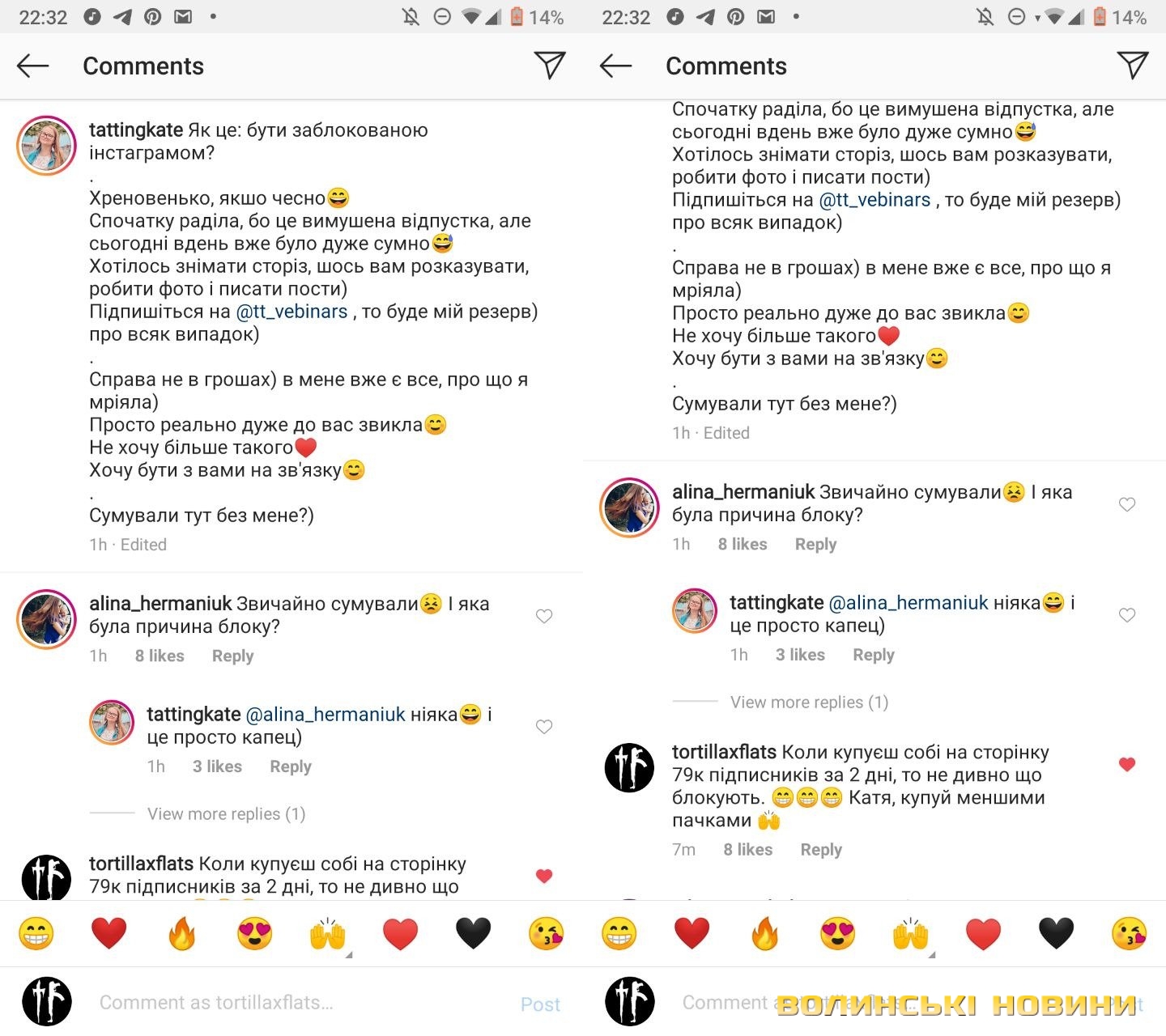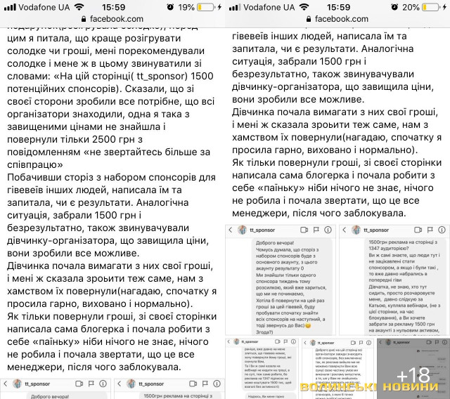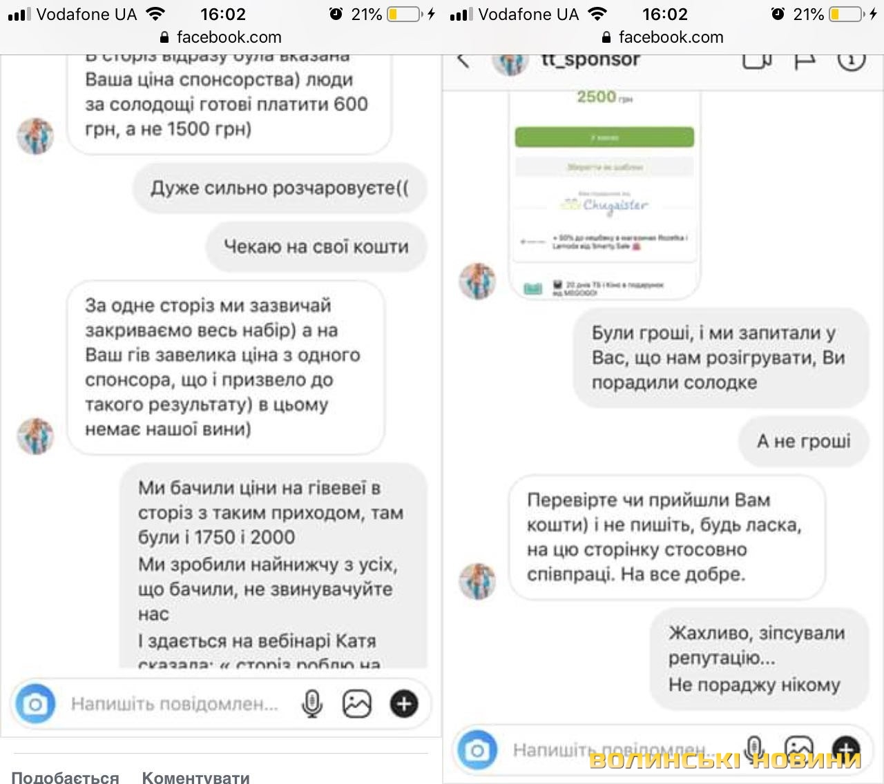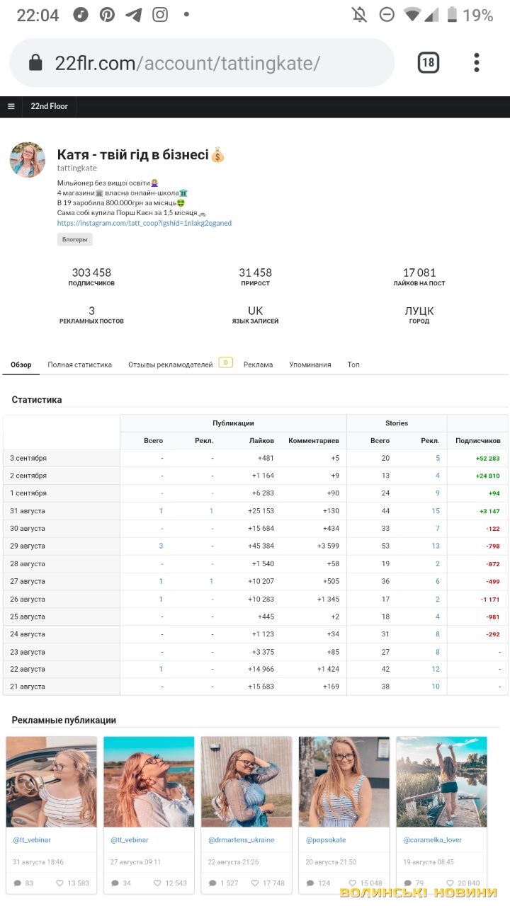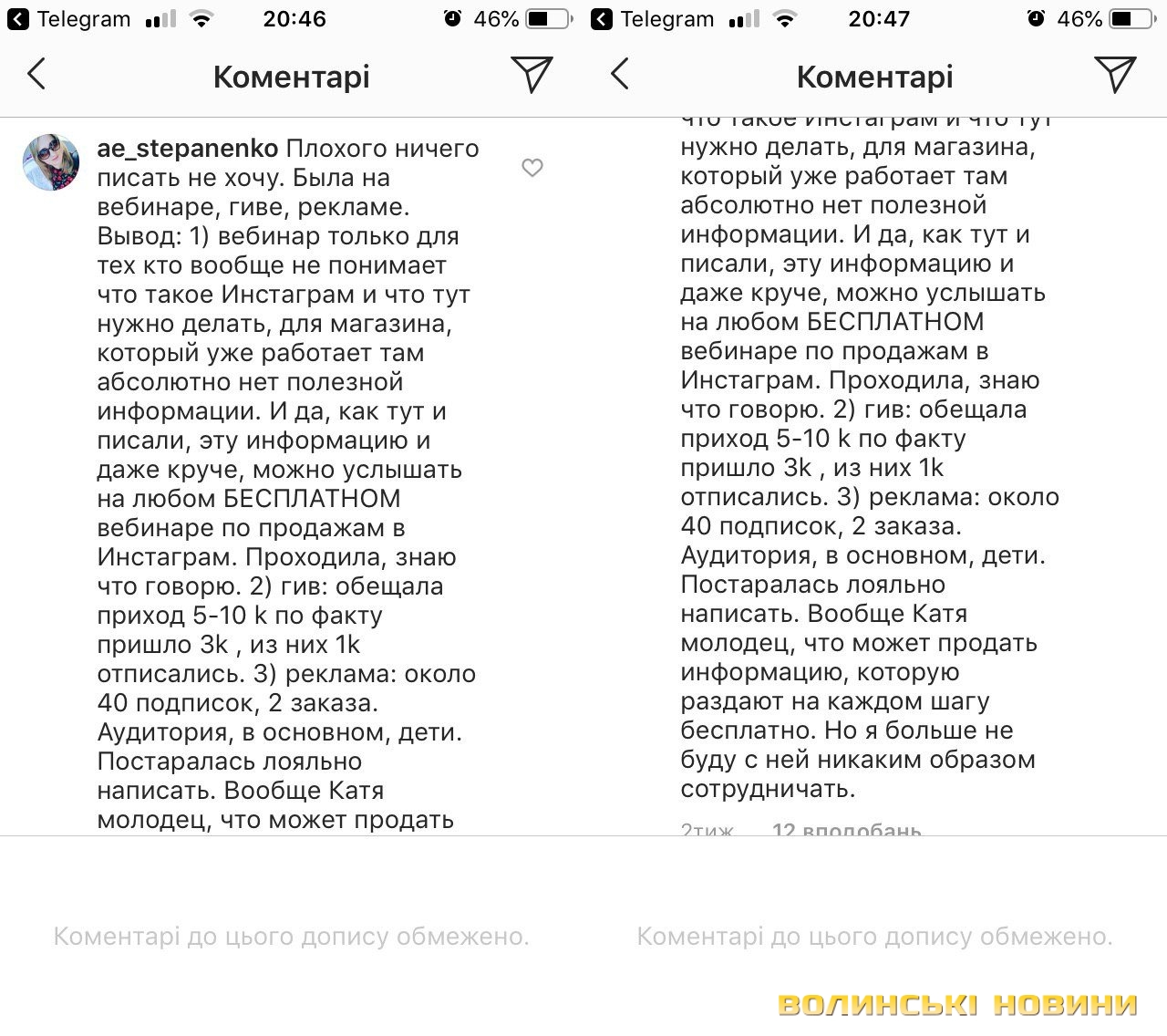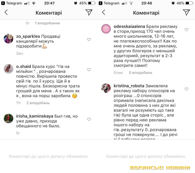Але для початку для розіграшу потрібно було набрати спонсорів (розіграш зі спонсорами – теж один з видів розкрутки акаунту, під час якого спонсори рекламують один одного і себе; серед умов таких розіграшів зазвичай підписка на акаунти всіх спонсорів). Користувачка пояснює: луцька блогерка отримала 4 тисячі гривень за те, щоб провести на її сторінці спонсорський розіграш. Оголошення про набір спонсорів мало бути опубліковане в акаунті, де є кілька сотень тисяч підписників безкоштовно. А вже сам розіграш – за гроші. Але опублікували оголошення на зовсім іншому, з малою кількістю підписників, акаунті, бо основий був заблокований. В результаті спонсори не знайшлися, і в блогерки попросили повернути гроші. Гроші та повернула не всі, а вирахувала вартість оголошення про набір спонсорів (що мало бути безкоштовно). І подібна ситуація, стверджує ошукана користувачка, відбувалася в багатьох, хто наважився на співпрацю.Крім того, згідно з даними сервісу, який перевіряє акаунти на ймовірність накрутки користувачів (він дозволяє перевірити рекламодавців), напередодні блокування акаунту, луцька блогерка «прикупила» близько 70 тисяч користувачів. Такий приріст нових користувачів за такий короткий термін чесними методами практично неможливий. Ймовірно, це і стало причиною блокування. Адже мережа Instagram дуже скрупульозно ставиться до проявів підозрілої активності.А на сторінці про ТОП-Блогерів є чимало коментарів від колишніх клієнтів луцької блогерки, які розчаровані її курсами. З їх слів більшість інформації не виявилася корисною та й є вона в безкоштовному доступі, тож гроші, які їй заплатили, виявилися даремними витратами. Подібні відгуки є й в інших чатах, де спілкуються представники бізнесу та інтернет-маркетингу на тему співпраці з українськими блогерами.Тож виявляється: історія луцької блогерки – яскрава ілюстрація того, що соцмережі не завжди правдиво відображають реальність. Тому перед тим, як вірити різним інтернет-гуру і платити за їх поради гроші, варто увімкнути критичне мислення і проаналізувати плюси і мінуси таких рішень.