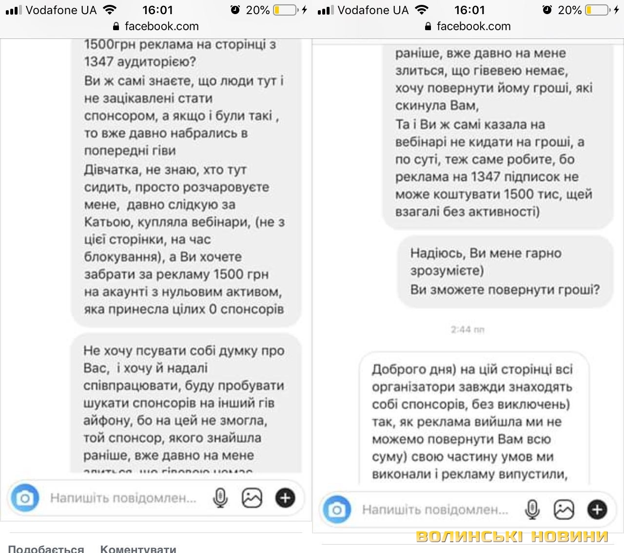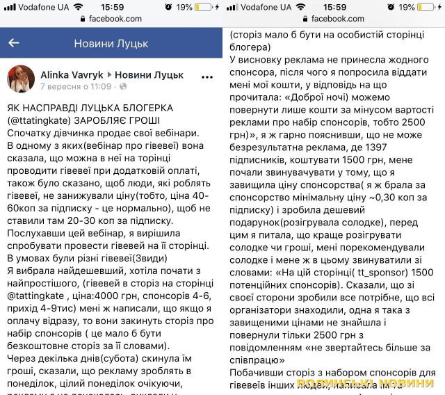 І ось днями в соцмережах з’явилася інформація про те, що блогерка, яку так активно розкручують місцеві видання (можливо й у вигляді прихованої реклами), не надто добросовісно заробляє кошти. Зокрема, одна з фейсбук-користувачок заявила, що після того, як прослухала вебінар Катерини про можливості розкрутки акаунту, вона вирішила провести на її сторінці (не безкоштовно) гівевей (giveaway – розіграш певного продукту серед підписників, які мають виконати вказані умови).