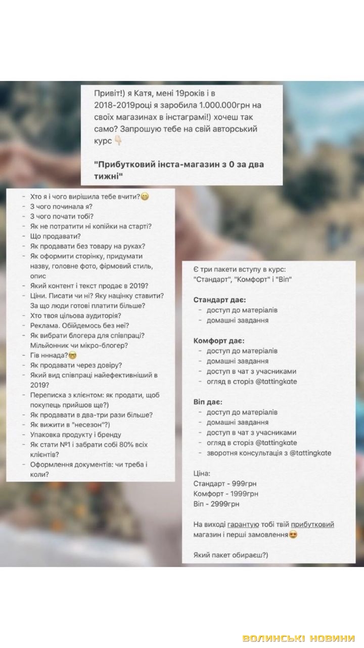 «Юна блогерка кинула університет і заробляє мільйони в Instagram», «Porsche Cayenne придбала у 19 років». Все частіше молода інстаблогерка Катя Якимчук з Луцька стає героїнею таблоїдних статей, наголошуючи на своїй успішності. Однак, велика слава і великі гроші нерідко йдуть поруч зі скандалами. І якщо з одного боку вони можуть забезпечити блогерам додаткову рекламу, то з іншого – можуть добряче попсувати репутацію. В один із таких скандалів і втрапила лучанка. Все більше інтернет-користувачів зізнаються, що корисної інформації з курсів, якими активно заробляє блогерка, вони не почерпнули. Натомість під гарно поданим соусом вони отримали загальнодоступну інформацію.