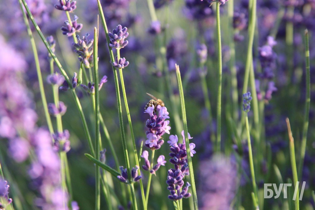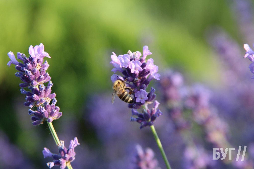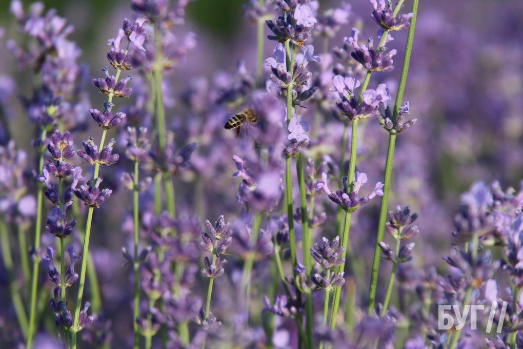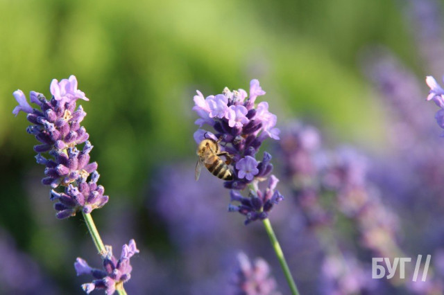 Над тоненькими квітами лаванди гудуть бджоли та інша комашня насичується нектаром.