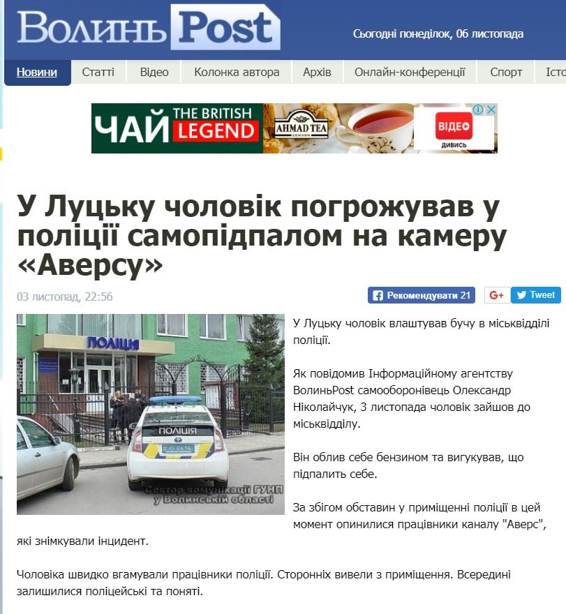 Через кілька хвилин на інтернет-ресурсі ВолиньPost з’явилася інформація буцімто у міському відділку поліції чоловік намагався себе підпалити спеціально перед камерами «Аверсу». Повідомив видання про спробу самоспалення сам Олександр Ніколайчук. Зауважимо, самооборонівець не був свідком події, адже з’явився вже після того, як чоловіка з міського відділку поліції забрали. Проте, за дивним збігом обставин, Ніколайчук чомусь був у курсі справи, хоча правоохоронці йому інформації про інцидент не надавали. Вочевидь, про цей інцидент активісти «Самооборони» дізналися з рації на поліцейських частотах.