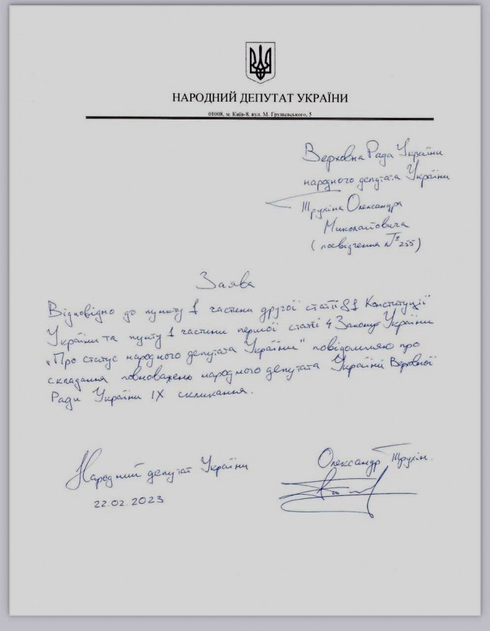 23 лютого Олександр Трухін, який 22 лютого пішов на угоду зі слідством і визнав свою провину в пропозиції хабара поліцейським, написав заяву про складання депутатського мандату.