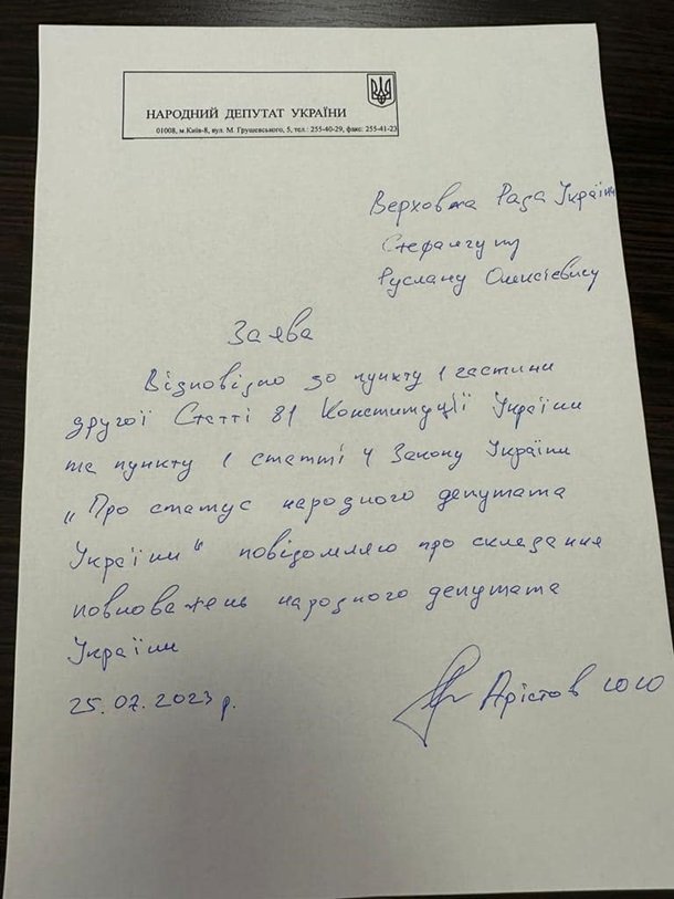 «До Верховної Ради України надійшла заява від народного депутата України Арістова Ю.Ю. про складання повноважень народного депутата України», – написав він.