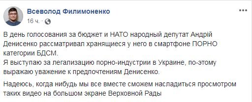 "Я виступаю за легалізацію порно-індустрії в Україні, тому висловлюю повагу до вподобань Денисенка. Сподіваюся, коли-небудь ми всі разом зможемо насолодитися переглядом таких відео на великому екрані Верховної Ради", - заявив журналіст.