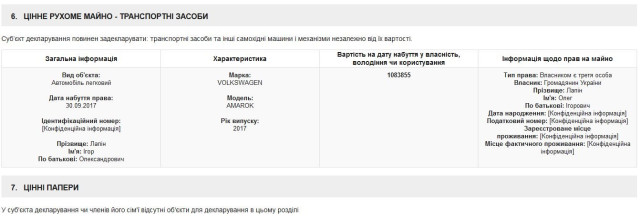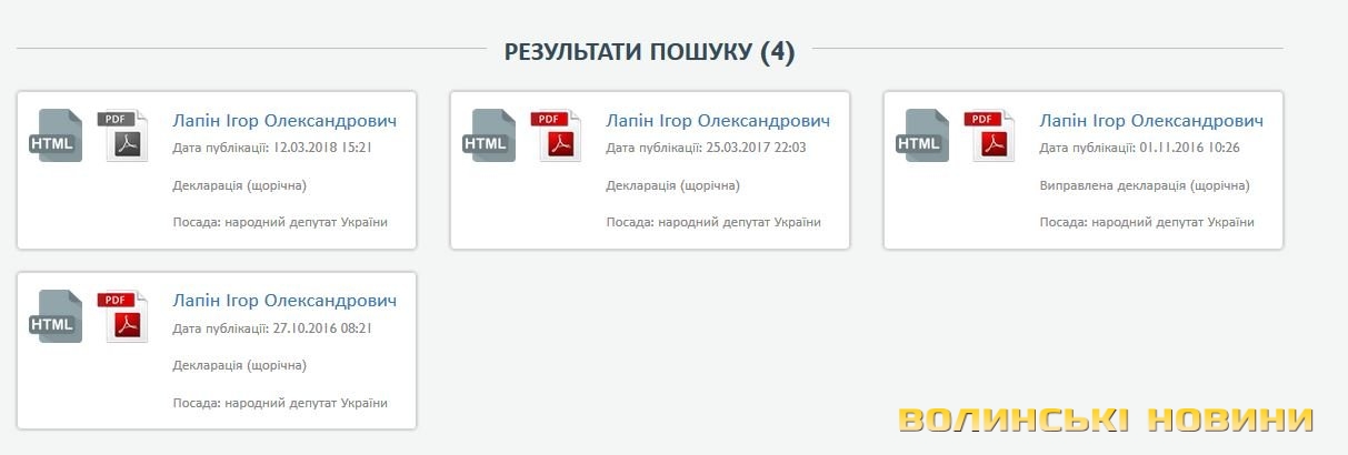 Зазначимо, що Volkswagen Amarok, який буцімто належить сину нардепа, було придбано наприкінці вересня 2017 року. Автомобіль – тієї ж моделі, що й транспортний засіб, який був зареєстрований на дружину Олега, котрий спалили в червні минулого року, поки Ігор Лапін перебував у Києві.Даних про інші автомобілі в декларації народного депутата немає. Однак ще у 2015 році нардеп декларував три авто, які перебували у власності його батька. Зокрема, це два BMW 520d 2012 року випуску та KIA Cerato 2010 року.Водночас, за інформацією Єдиного державного реєстру МВС України, родина Ігоря Лапіна цього року поповнилася двома новенькими автомобіля. Так, 20 лютого Лапін зареєстрував Nissan Primastar 2013 року випуску (орієнтовна вартість – 314 тисяч гривень). А 13 березня легковик Renault Megane 2017 року (вартість близько 500 тисяч гривень) зареєстрував його батько Олександр.Відповідно до ч. 2 ст. 52 Закону України «Про запобігання корупції», у випадку суттєвої зміни майнового стану, йдеться, зокрема, про придбання майна на суму, що перевищує 50 мінімальних заробітних плат (близько 186,15 тисячі гривень), декларант зобов’язаний протягом 10 днів повідомити про це Національне агентство з питань запобігання корупції. Однак, схоже, що нардеп проігнорував вимогу закону, адже відомості про купівлю автомобілів на сайті Єдиного державного реєстру декларацій відсутні.Одночасно простежується зростання доходів і грошових активів нардепа. Так, минулого року зарплатня Ігоря Лапіна збільшилася на 87,568 тисячі гривень – із 155,537 тис. у 2016 році до 243,105 тис. грн у 2017 році.Також у народного обранця є 28 тисяч доларів, 17 тисяч євро і 60 тисяч гривень готівки.Серед об’єктів нерухомості у власності – дві земельні ділянки у селі Любитів Ковельського району (площею 5970 кв. м) і Ковелі (1000 кв. м), приміщення з асфальтним майданчиком у Любитові (1285,7 кв. м) та квартира в Липинах Луцького району (40,1 кв. м).