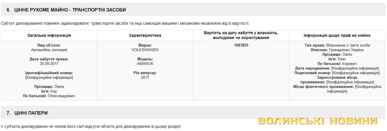 Народний депутат, обраний від Луцька, Ігор Лапін задекларував автомобіль за понад 1 мільйон гривень. Йдеться про Volkswagen Amarok 2017 року випуску, зареєстрований на його сина Олега. Водночас нардеп не подав інформації про будь-які суттєві витрати, навпаки, статки Ігоря Лапіна протягом року лише зросли. Також із декларації зникли три автівки, попередньо зареєстровані на батька народного обранця Олександра. А дві нові машини, зареєстровані у 2018 році, Ігор Лапін взагалі забув вказати.