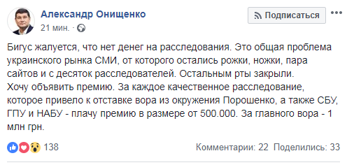 Після публікації чергової частини розслідування журналістів «Наших Грошей» про те, як оточення президента Порошенка організувало схему розкрадань в оборонці, народний депутат Олександр Онищенко на своїй сторінці в Facebook заявив, що готовий заплатити 500 тисяч гривень за кожне якісне розслідування, яке «призвело до відставки злодія з оточення Порошенка», а також СБУ, ГПУ і НАБУ.