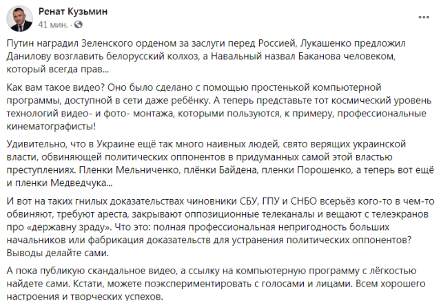 «Як вам таке відео? Воно було зроблене за допомогою простенької комп’ютерної програми, доступної в мережі навіть дитині. А тепер уявіть той космічний рівень технологій відео- і фотомонтажу, якими користуються, наприклад, професійні кінематографісти! Дивно, що в Україні ще так багато наївних людей, котрі щиро вірять українській владі, яка звинувачує політичних опонентів в придуманих самою цією владою злочинах. Плівки Мельниченка, плівки Байдена, плівки Порошенка, а тепер ось ще й плівки Медведчука...» – написав нардеп.
