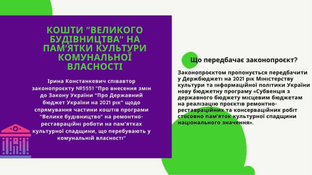 Народна депутатка Ірина Констанкевич разом з колегами зареєструвала законопроєкт № 5551 «Про внесення змін до Закону України «Про Державний бюджет України на 2021 рік» щодо спрямування частини коштів програми «Велике будівництво» на ремонтно-реставраційні роботи на пам’ятках культурної спадщини, що перебувають у комунальній власності».