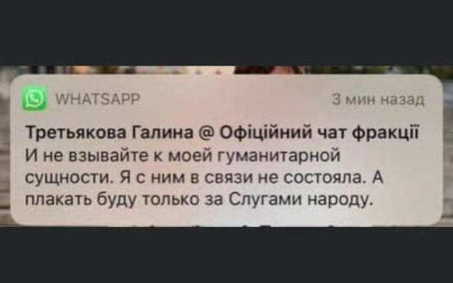 Голова комітету з питань соціальної політики, нардепка від «Слуги народу» Галина Третьякова в партійному чаті пораділа зі смерті нардепа із фракції «ЗА Майбутнє» Антона Полякова. Лідер партії Ігор Палиця з трибуни Верховної Ради звернувся до «слуг» з вимогою дати оцінку таким висловам, після чого депутати почали скандувати «ганьба» Третьяковій.