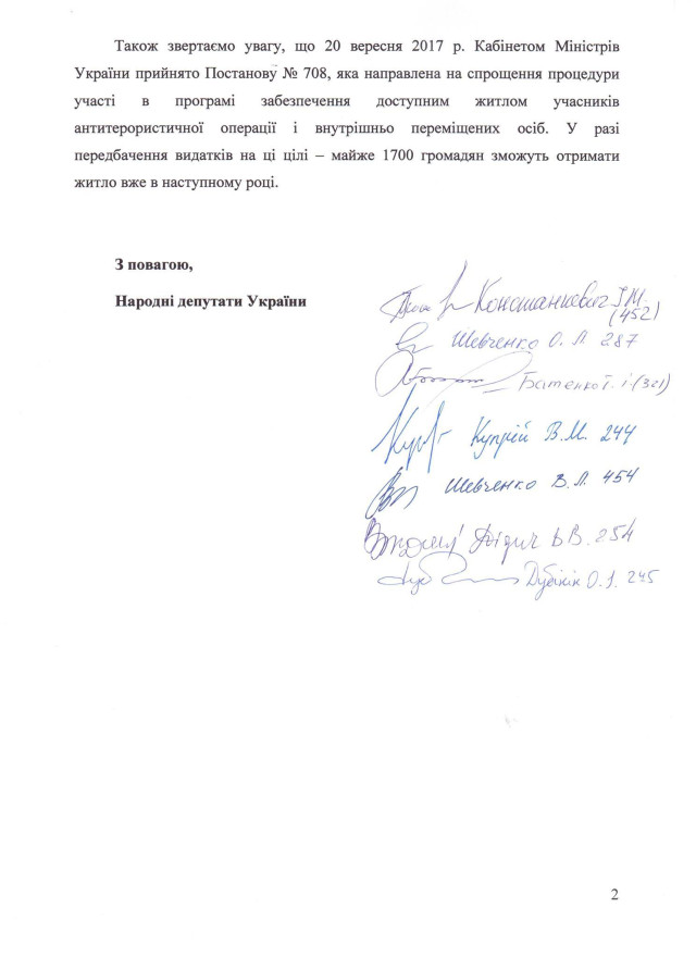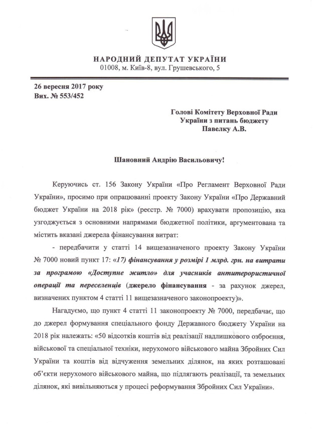 «Просимо при опрацюванні проекту Закону «Про державний бюджет України на 2018 рік» врахувати пропозицію, яка узгоджується з основними напрямами бюджетної політики, аргументована та містить вказані джерела витрат: передбачити у статті 14 проекту ЗУ № 7000 новий пункт 17: «17) фінансування в розмірі 1 млрд грн на витрати за програмою «Доступне житло» для учасників антитерористичної операції та переселенців», – ідеться в документі.
