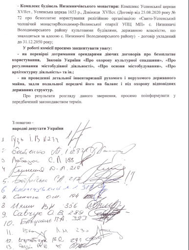 «Звертаємось до Вас з проханням дати доручення Міністерству культури та інформаційної політики України, Волинській обласній військовій адміністрації (іншим профільним державним структурам) про організацію роботи комісії, яка проведе вичерпне обстеження нижчезазначених культових споруд (пам’яток архітектури національного значення), що орендуються релігійними організаціями Української православної церкви московського патріархату та розташовані на території Волинської області», – йдеться у зверненні.