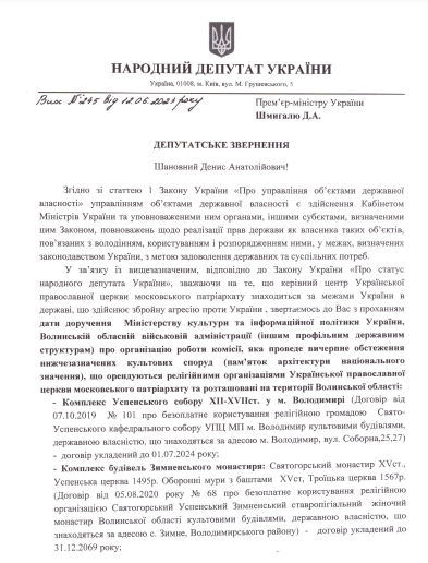 Народний депутут від Волині Ігор Гузь підготував звернення до прем’єр-міністра України Дениса Шмигаля, у якому просить перевірити три святині на Волині – комплекси споруд Зимненського та Низькиничівського монастирів, а також Успенський собор у Володимирі. Підтримали звернення 46 народних депутатів.